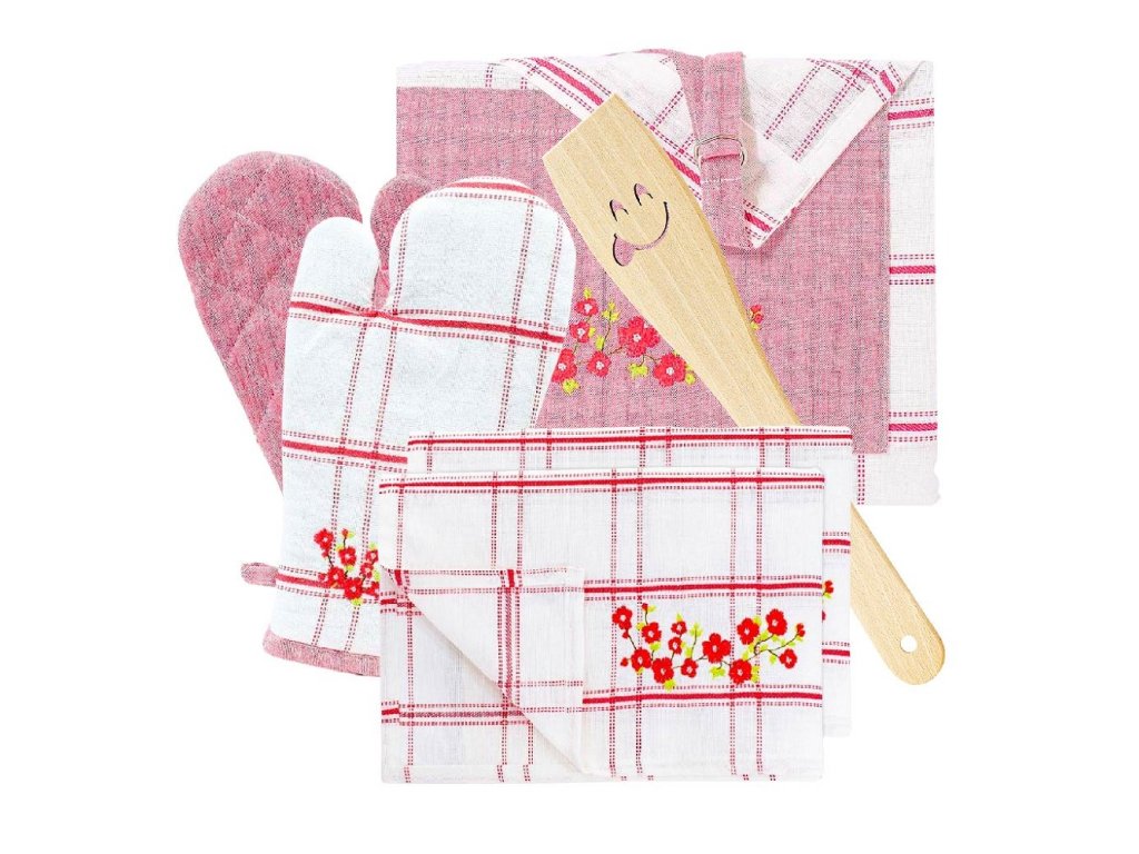 - Obsah balení: zástěra, chňapka, utěrky, dřevěná vařečka