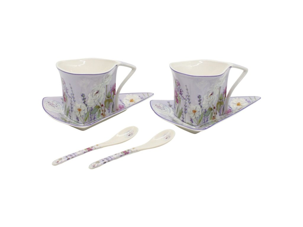 HOME ELEMENTS Sada dvou šálků 250ml levandule s podšálky a lžičkami