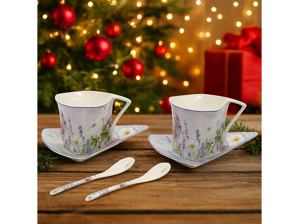 Exkluzivní porcelánový set v bílé barvě zdobený jemnými kvítky růže a levandule. Je povznášející vychutnávat si čaj nebo kávu z tak krásného šálku. Sada je poskládaná do dárkové krabičky. Pokud chcete někomu věnovat, nemusíte si dělat starosti s hezkým balením. Stačí krabičku ozdobit mašlí nebo dát do dárkové tašky.