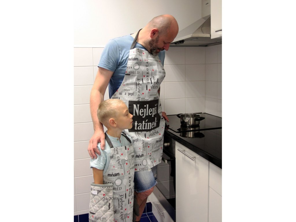 Darujte mu praktické textilní pomocníky do kuchyně s nápisem Nejlepší tatínek. Výhodný set obsahuje slušivou zástěru, prošívanou chňapku a 2 kusy utěrek. Vše je potřebné v kuchyni každý den nebo třeba při grilování. Set je sladěný v šedých barvách, s potiskem kuchyňských motivů a inspirativních textů.